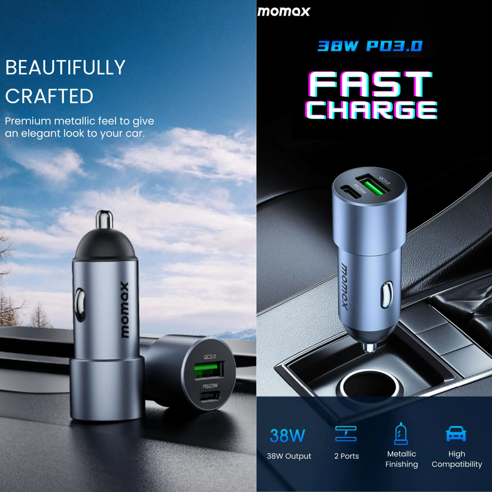 Încărcătorul auto Momax 38W PD 3.0 redefinește standardele de alimentare în mișcare. Cu un corp din aliaj metalic premium ce oferă un aspect elegant și o durabilitate sporită, acest adaptor Dual-Port permite încărcarea simultană a două dispozitive la viteze incredibile. Portul dedicat USB-C PD 20W este ideal pentru noile generații de telefoane, în timp ce portul USB-A QC 3.0 oferă versatilitate maximă pentru orice alt gadget.