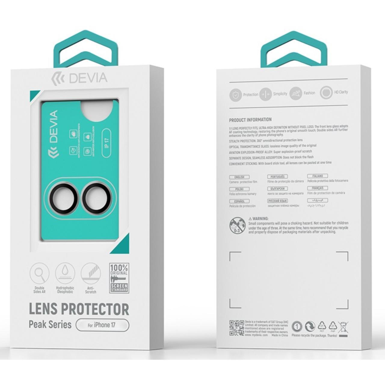 Folie Sticla Camera Peak Series Crystal iPhone 17 de la Devia, este fabricata din sticla premium cu marginile realizate din policarbonat (transparent) si ofera o protectie suplimentara impotriva zgarieturilor si murdariei.