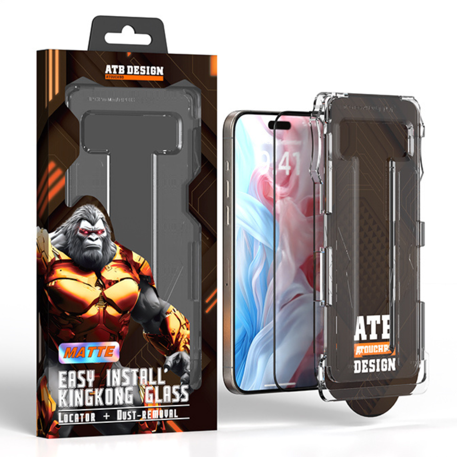 Kit-ul de protecție KingKong Glass de la ATB DESIGN este special conceput pentru iPhone și oferă o instalare ușoară datorită sistemului Easy Install cu locator + sistem de îndepărtare a prafului. Folia de sticlă are finisaj mat pentru reducerea reflexiilor și a amprentelor, fiind ideală pentru utilizarea în condiții de lumină puternică sau expunere îndelungată la ecran.
