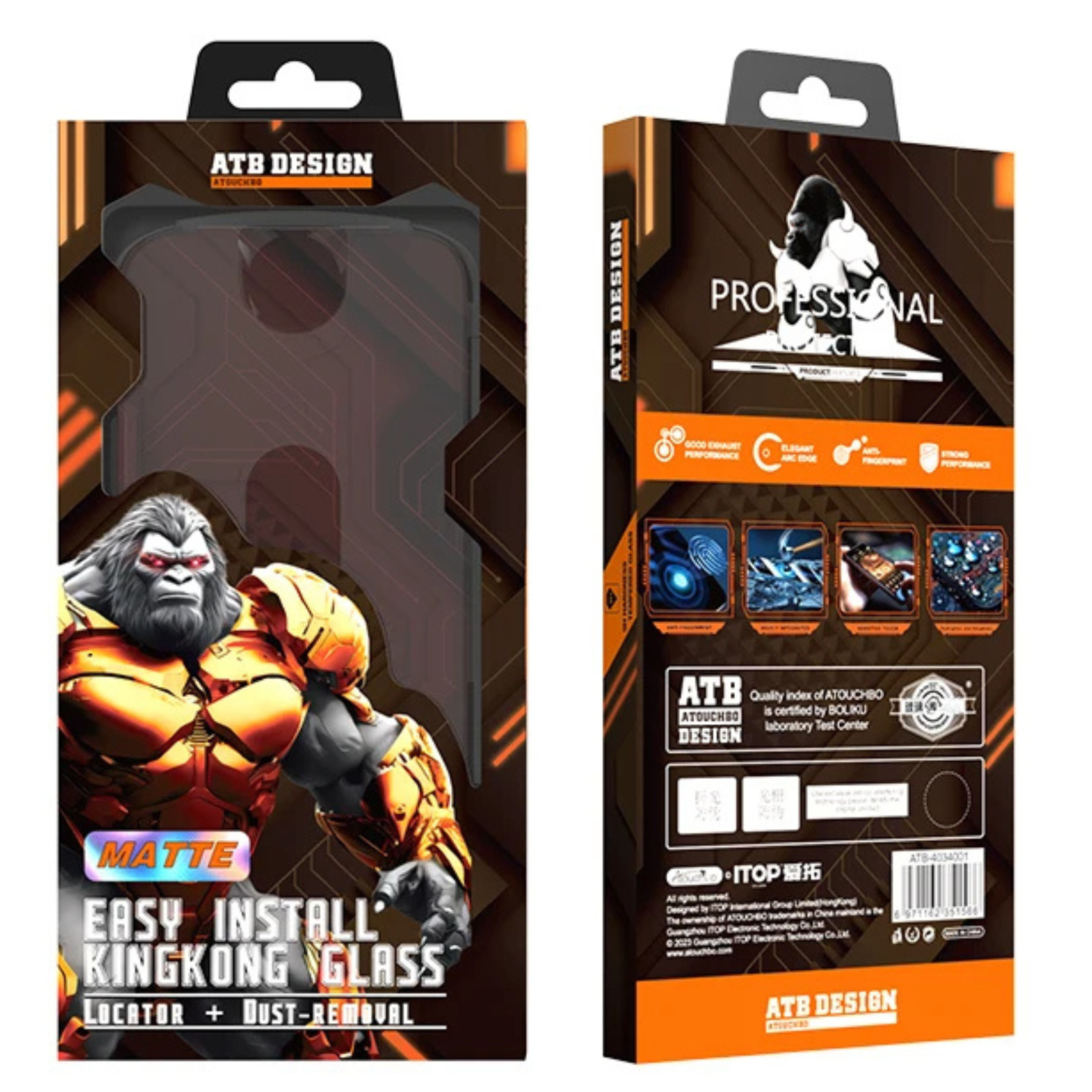 Kit-ul de protecție KingKong Glass de la ATB DESIGN este special conceput pentru iPhone și oferă o instalare ușoară datorită sistemului Easy Install cu locator + sistem de îndepărtare a prafului. Folia de sticlă are finisaj mat pentru reducerea reflexiilor și a amprentelor, fiind ideală pentru utilizarea în condiții de lumină puternică sau expunere îndelungată la ecran.