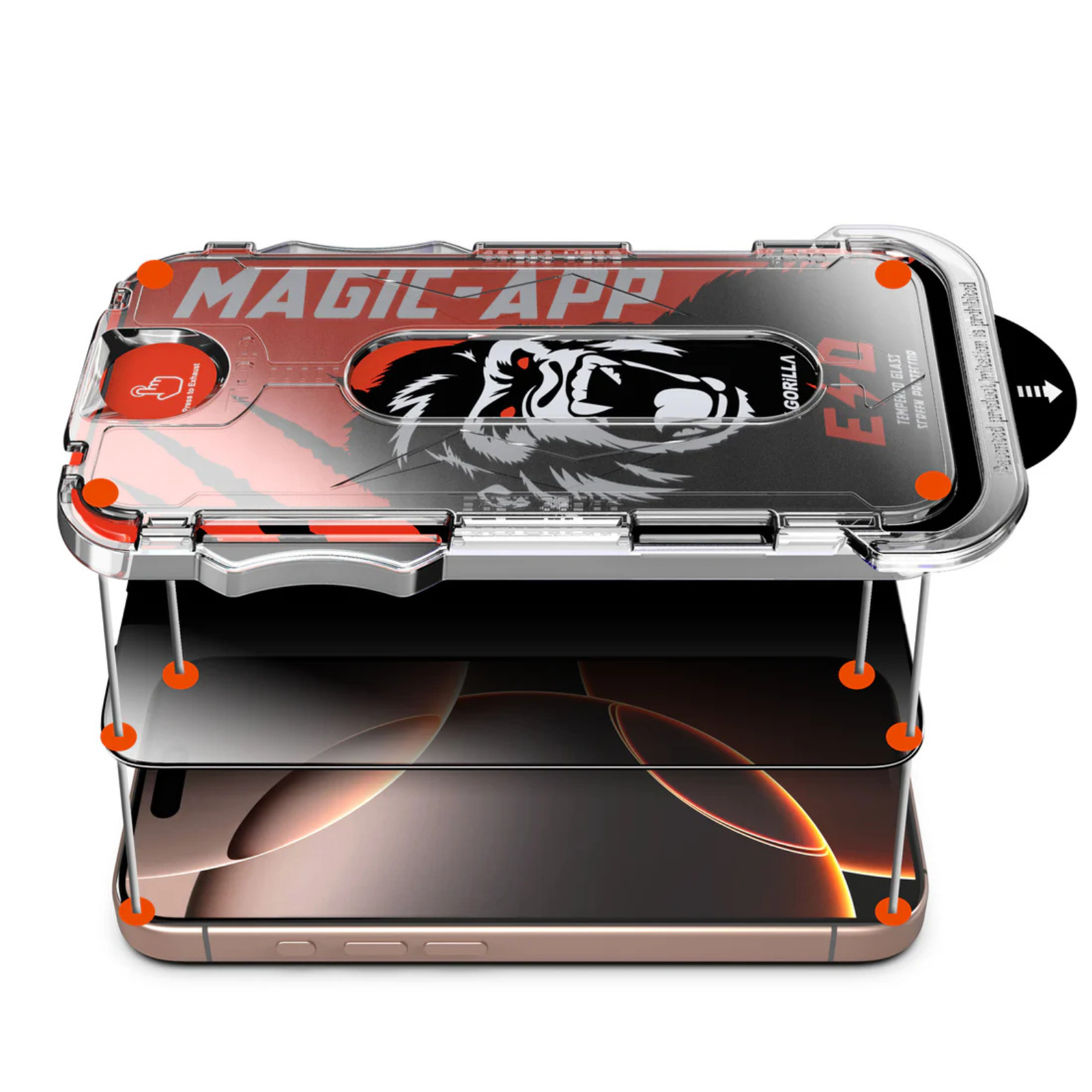 Protejează-ți telefonul cu folia de sticla Privacy X- Gorilla Glass Magic-App. Datorită tehnologiei inovatoare a Kit-ului de aplicare fără praf și a sticlei securizate 9H, ecranul rămâne clar, rezistent la zgârieturi. Instalare rapidă și precisă cu ajutorul cadrului de ghidaj. În plus, efectul Privacy limitează unghiul de vizibilitate, protejând informațiile personale de privirile indiscrete.