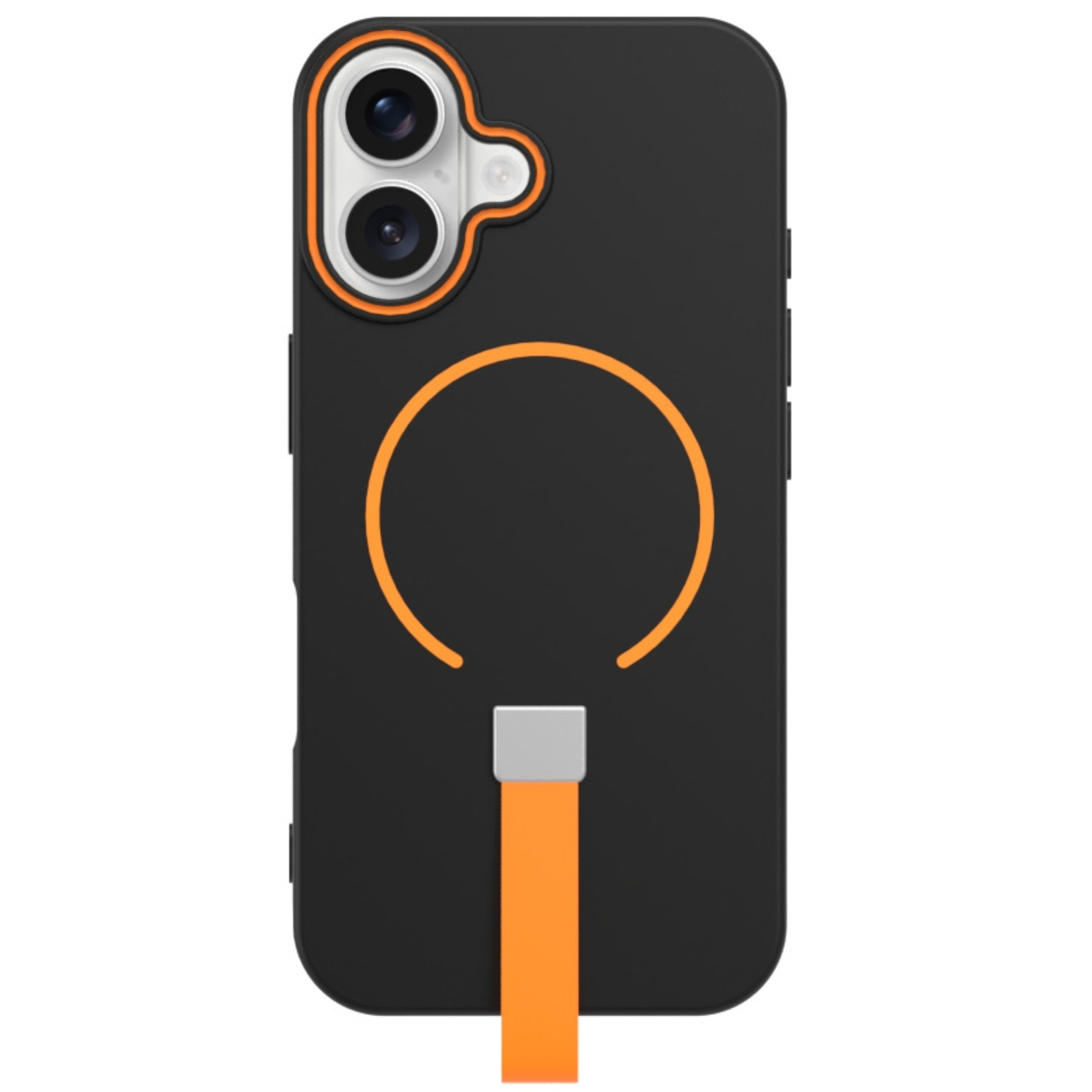 Cureaua din silicon portocalie de pe spate face mai ușor să ții telefonul și să-l folosești cu o singură mână.