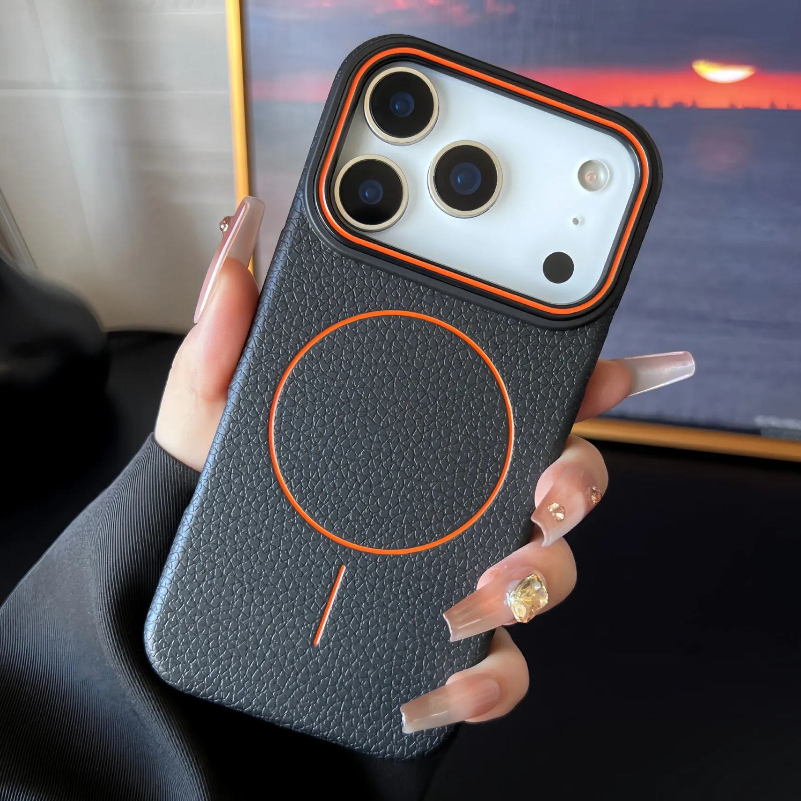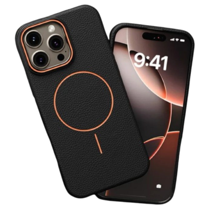 Husa pentru iPhone din silicon texturat cu interior din piele, compatibilă MagSafe, oferă protecție premium și un aspect elegant. Exteriorul din silicon plăcut la atingere asigură aderență excelentă, iar interiorul căptușit cu piele protejează telefonul împotriva zgârieturilor. Design subțire, ideală pentru utilizare zilnică fără a compromite stilul.